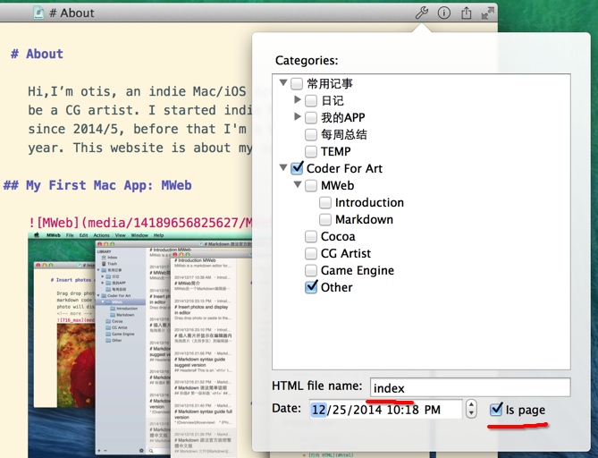Use "header.html+post.html+sidebar.html+footer.html" templates when the document Is page is disable; use "header.html+page.html+footer.html" templates when the document Is page is enable. You can add a page-{HTML file name}.html template for custom Is page enable document's template. MWeb will use "header.html+page-{HTML file name}.html+footer.html" when you add page-{HTML file name}.html template. For example: http://coderforart.com's theme have page-index.html template for home page https://github.com/oulvhai/MWeb-Themes/blob/master/mweb-greyshade/page-index.html .