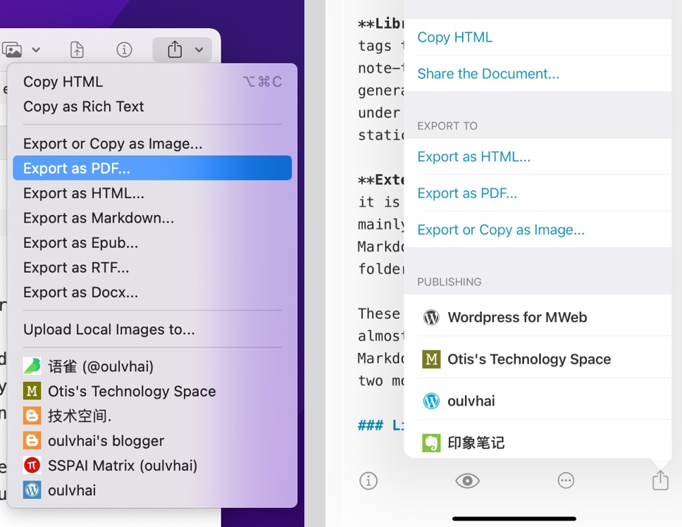 MWeb supports exporting documents as image, HTML, PDF, and the macOS version also supports exporting as Epub, RTF and Docx. The usage method is shown in the figure below.