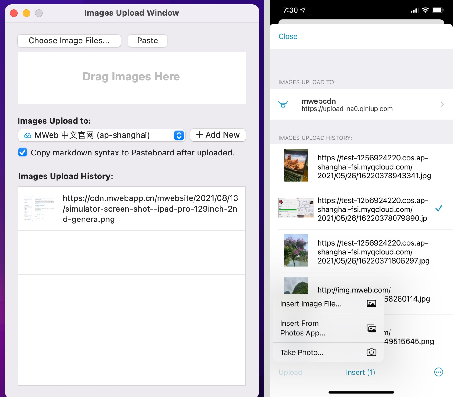The image upload service supports Imgur, sm.ms, Tencent Cloud, Qiniu Cloud, Youpai Cloud, Alibaba Cloud and customized image upload services. To use the image upload service, please add an image upload service first. In MWeb for macOS, please add image upload service in Preferences - Publishing; in MWeb for iPadOS/iOS, please add image upload service in Settings Page - Image Upload. There are two processing methods for using the image upload service in MWeb, which are described below: