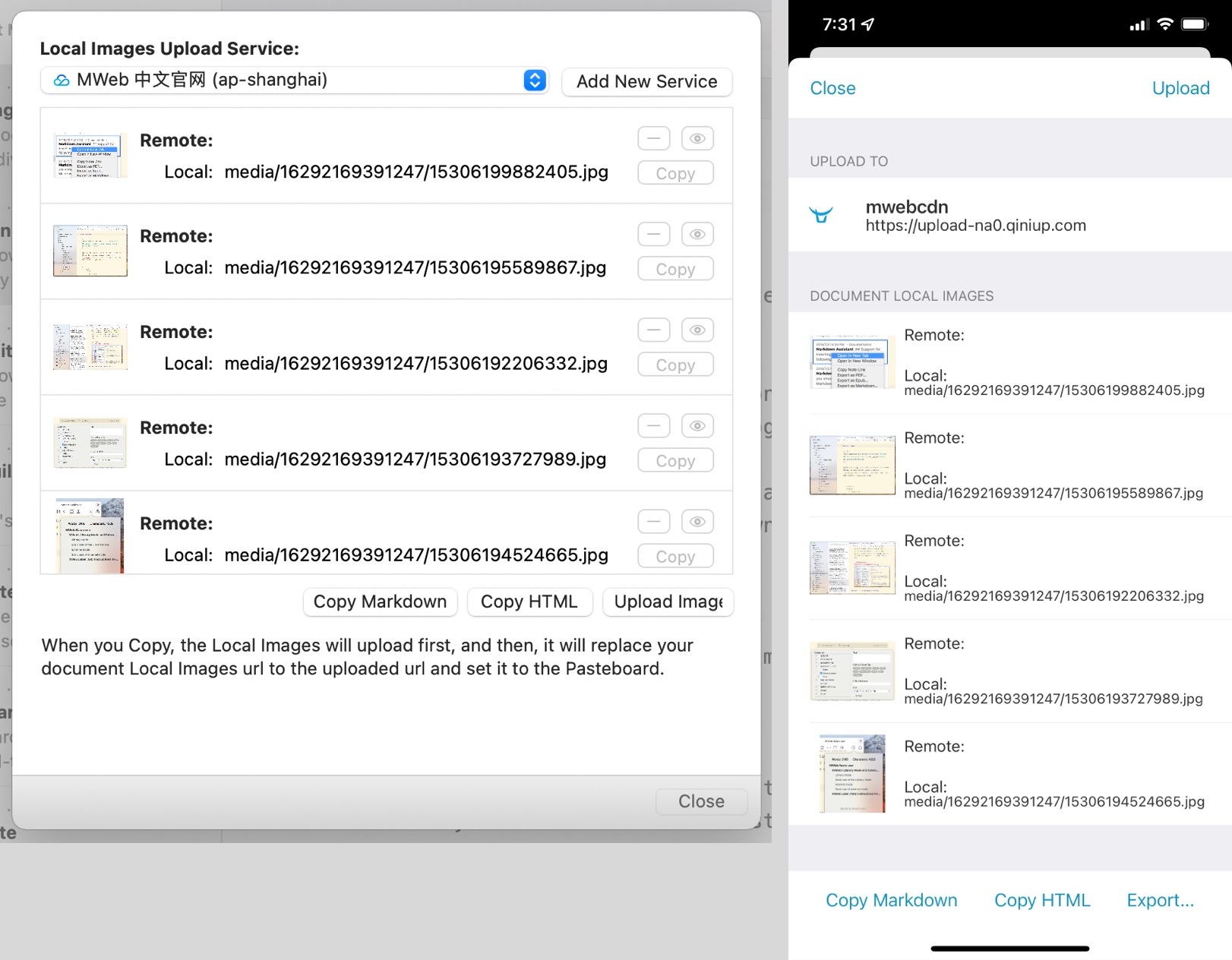This is the method recommended by MWeb. In this way, you only need to complete the writing of the document. When you need to upload the images in the document to the image upload service and publish them, in MWeb for macOS, please use the menu: Publish - Upload Local Image to...; in MWeb for iPadOS/iOS, please click the Share button at the bottom of the editor and select the image upload service that you want to upload to. After the operation is performed, the image upload interface as shown below will be displayed: