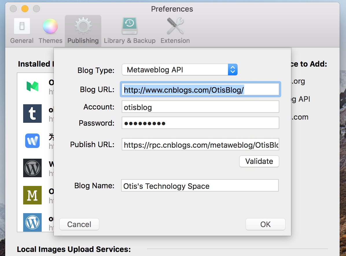 In the Add Publishing Service, select the Metaweblog API and the following interface will appear. In the pop-in project posted to the Metaweblog API, an item called "API Address" is added. Each website that supports the Metaweblog API provides an API address and fills in.