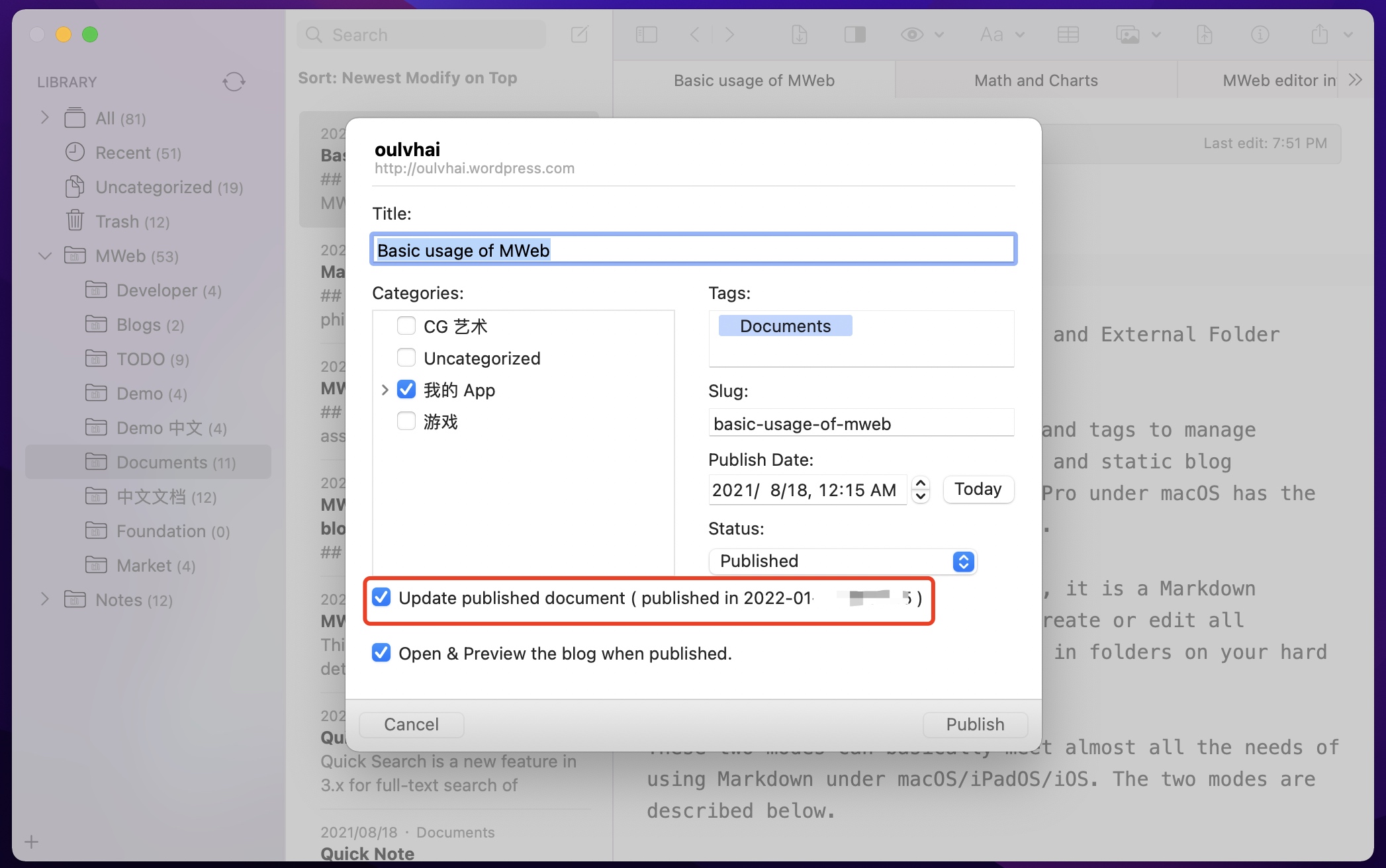 Almost all publishing services support publishing local images. Except for Medium, almost all publishing services support updating. That is to say, for the same publishing service, after you publish it once, when you publish it again, the document will be updated. If you uncheck the update checkbox, a new article will be published, as shown below:
