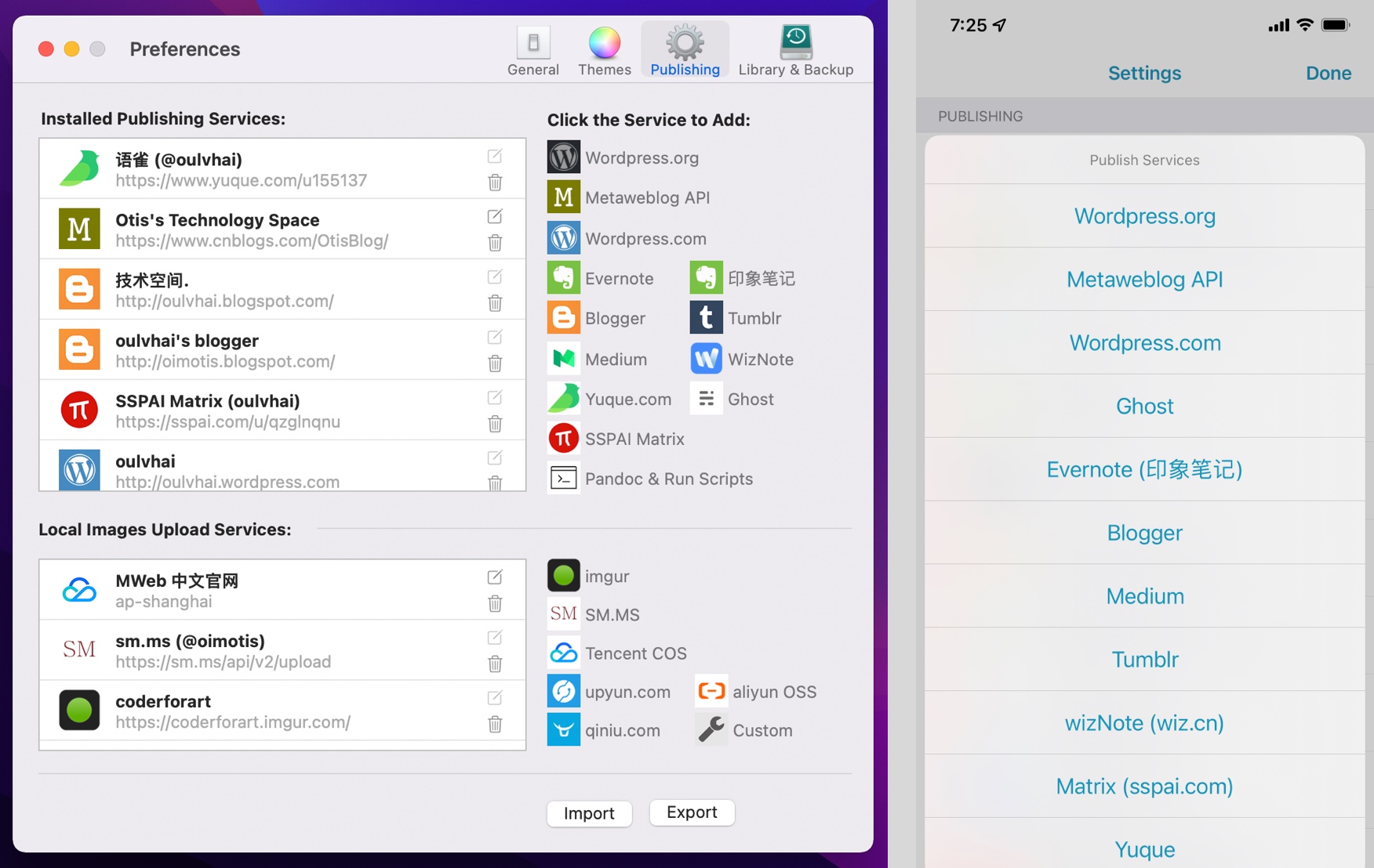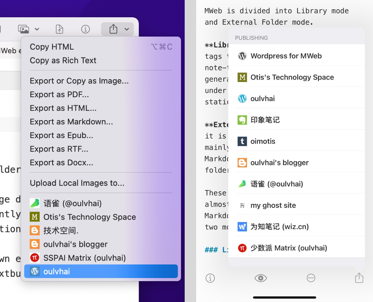 Use MWeb to publish documents to Wordrpess, services that support the Metaweblog API protocol, Wordpress.com, Evernote, Ghost, Yuque, SSPAI Matrix, Blogger, Medium, Tumblr, and more.