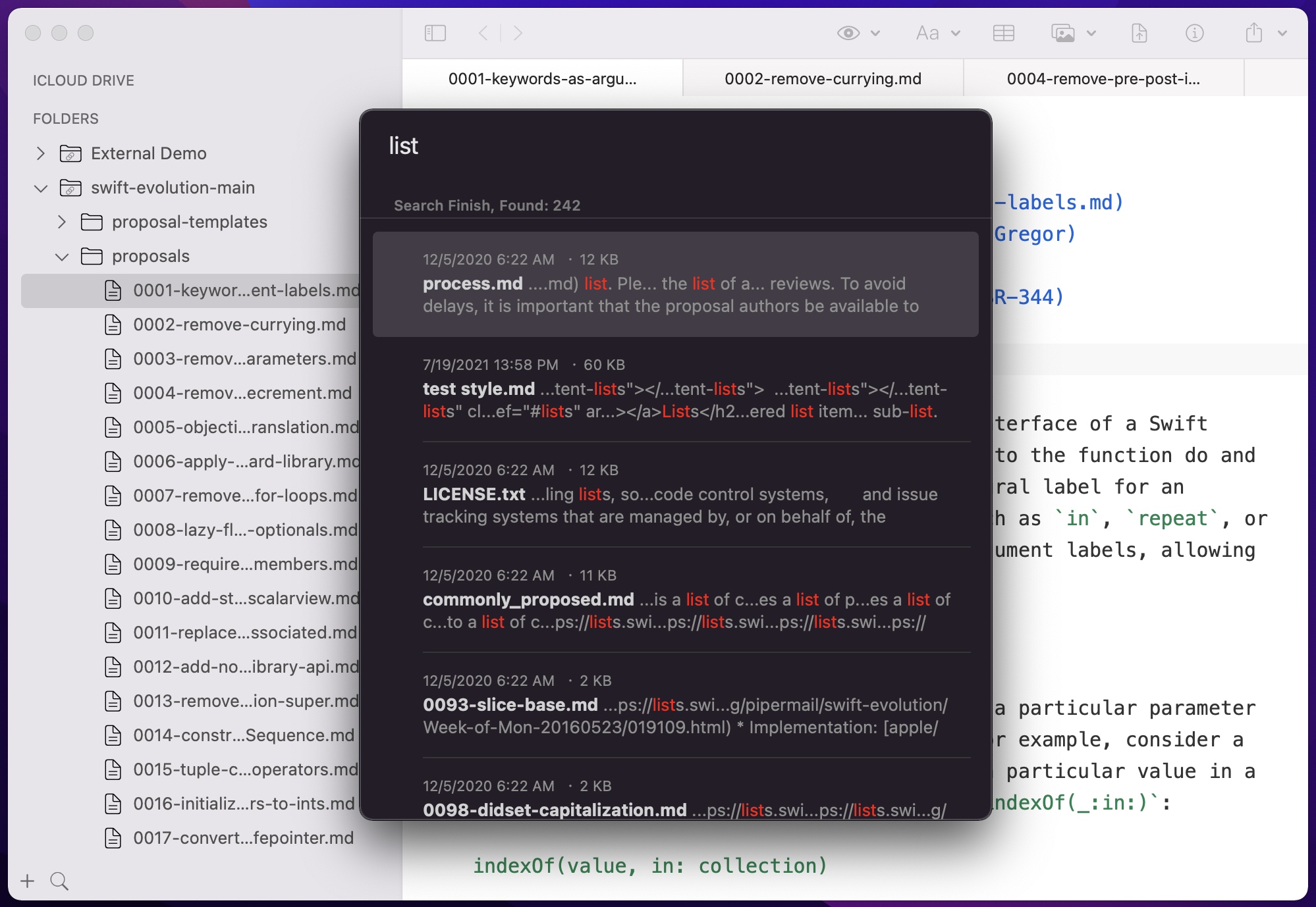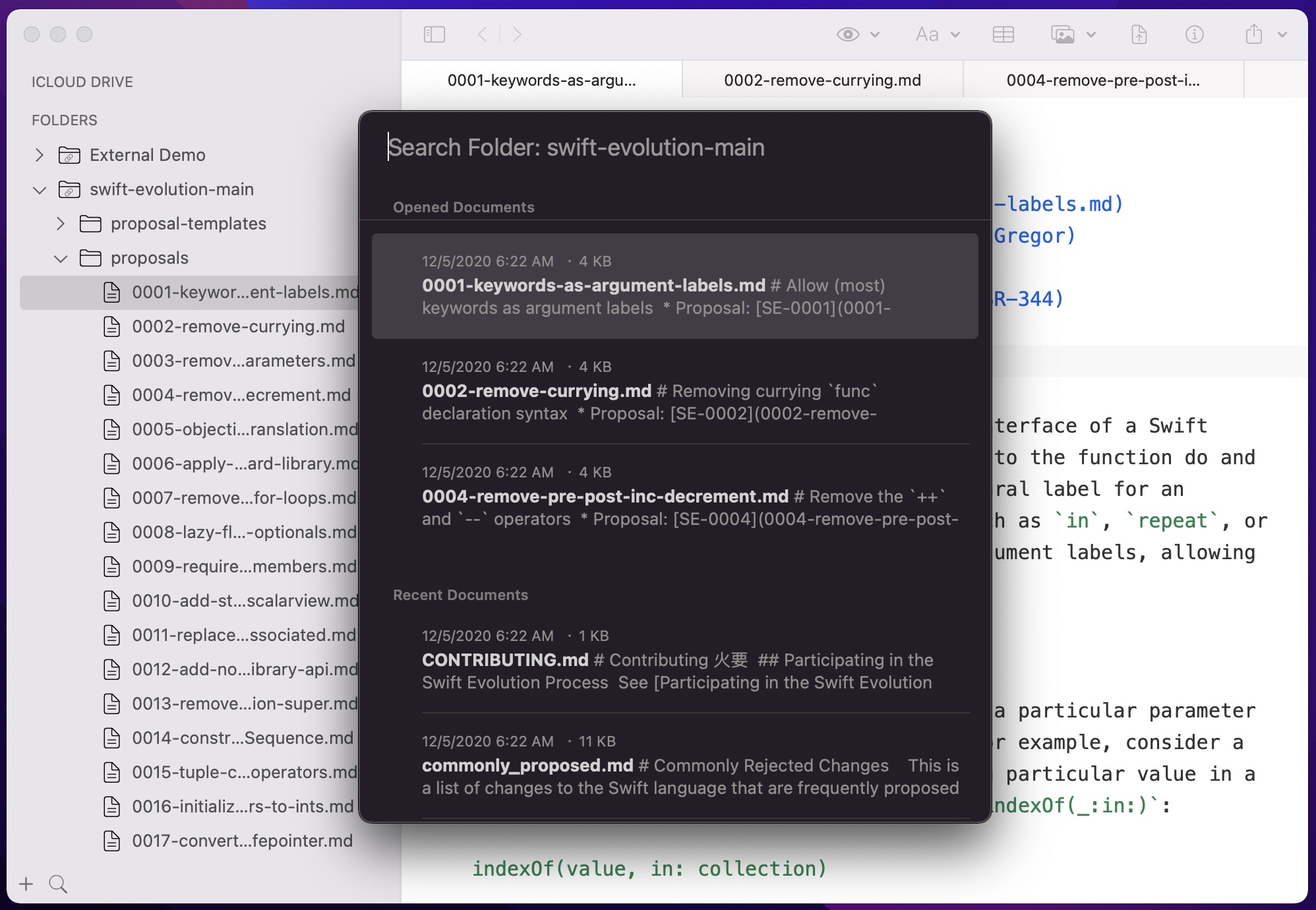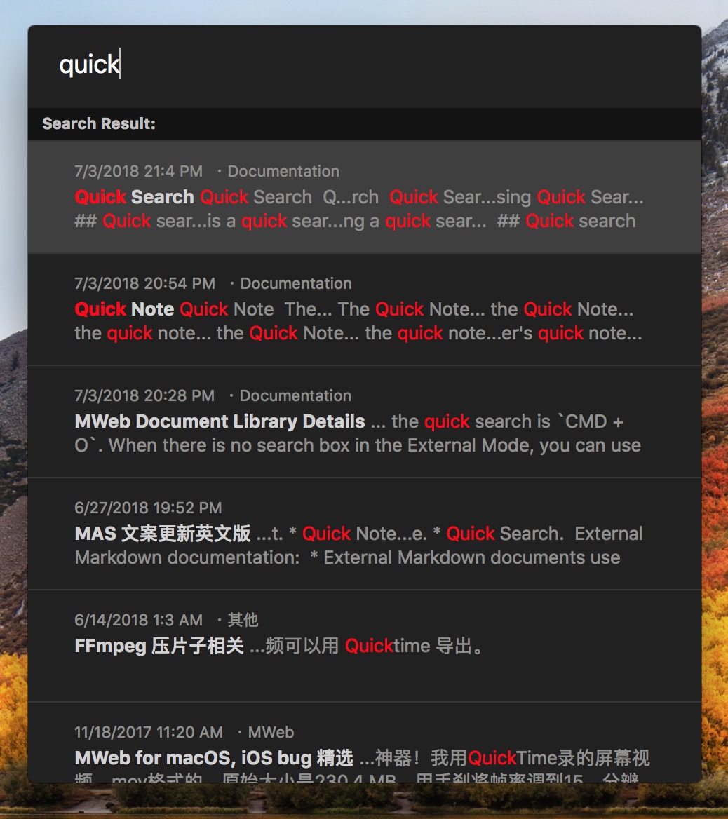 In MWeb for iPadOS/iOS, you can click the search box at the top to perform full-text search. In the macOS version of MWeb, there is has a quick search feature. The following instructions are related to the quick search feature of the macOS version of MWeb. Quick Search is a new feature in version 3.x and above for full-text search of Markdown files in Library or folders. Using Quick Search is as simple as pressing CMD + O in the Library mode interface or in the External Folder mode interface.