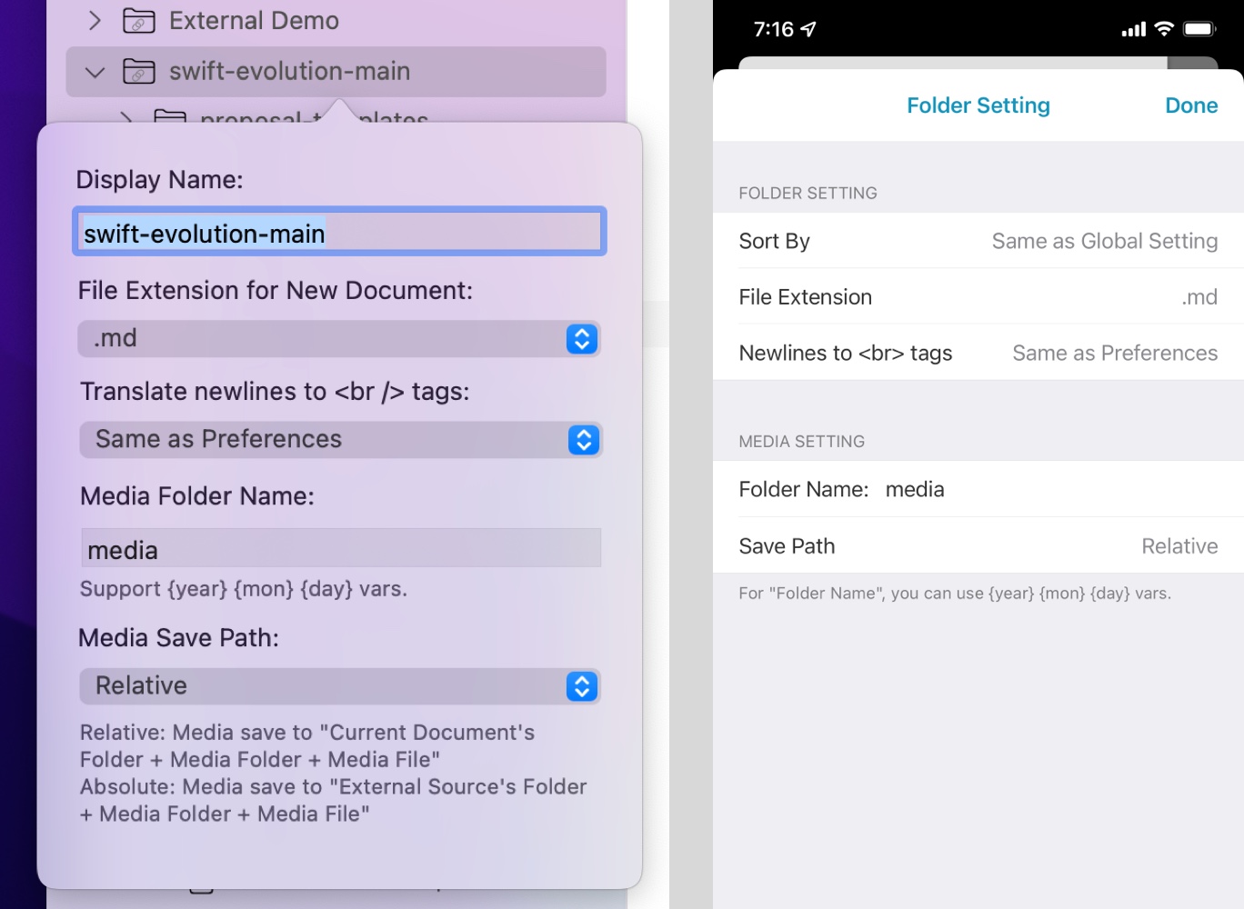Each folder imported into MWeb will have setting items as shown below. In MWeb of macOS, right-click the imported folder and select Edit to call up this setting interface; in iPadOS/iOS, click the (i) button to the right of the imported folder on the home page to call up this setting interface .
