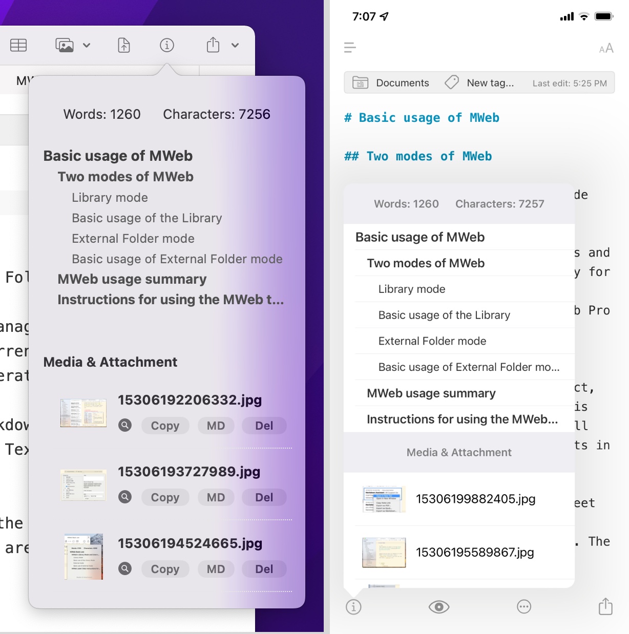 View the outline of the document: As shown below, in macOS, you can click the (i) button on the toolbar to view the outline of the document, or you can use the shortcut CMD + 7. If you want to pin this outline view, you can directly drag it to pin it, or you can use the "View" menu to set the pinned position. In iPadOS/iOS, you can click the (i) button at the bottom of the editor to view the outline.