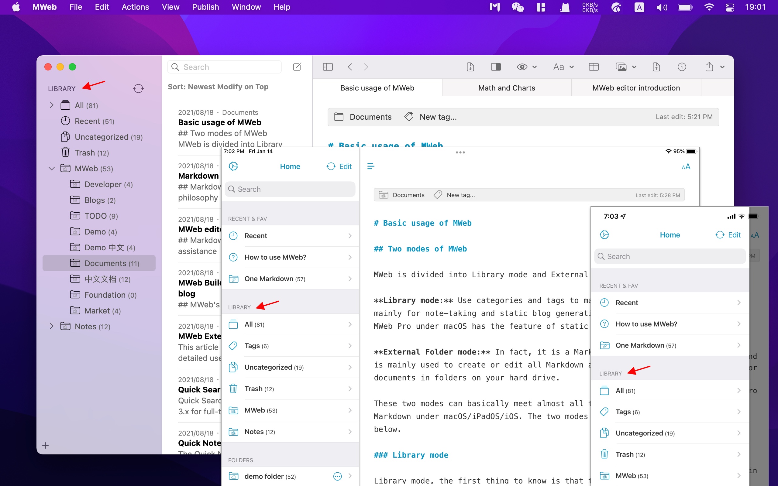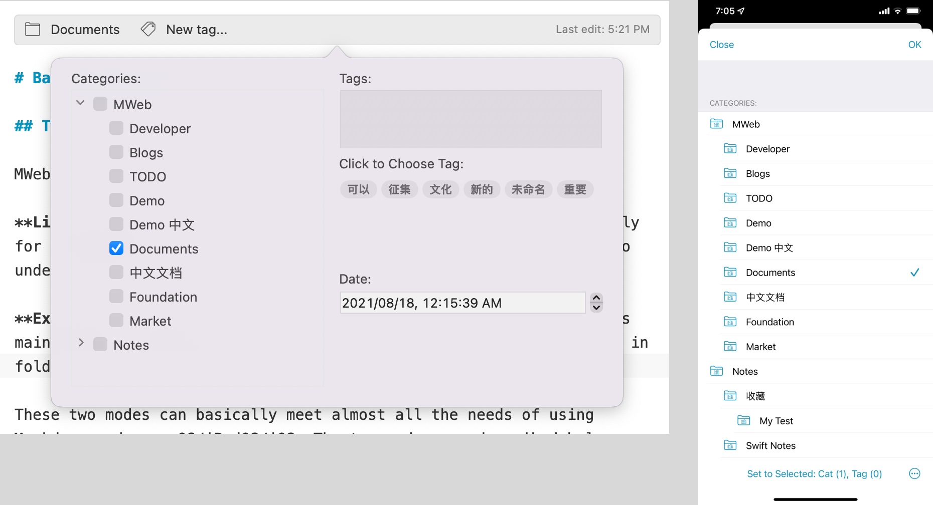 Library mode: Use categories and tags to manage documents, mainly for note-taking and static blog generation. Currently, only MWeb Pro under macOS has the feature of static blog generation.