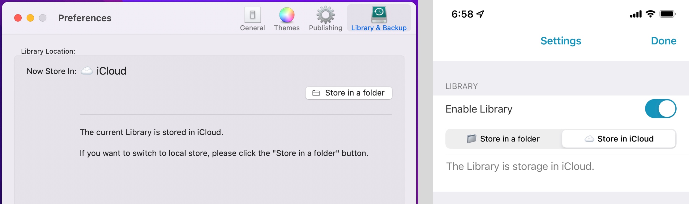 Library mode, the first thing to know is that the current Library is stored in. When you use MWeb for the first time, you will be asked to set the storage location of your documents, you can store the Library in a folder, or in iCloud. In addition, you can check the storage location of your Library at any time in Preferences. Under macOS, you can check it in Preferences - Library & Backup, and on iPadOS/iOS, you can check it in Settings Page - Library. If you want to sync your Library across multiple devices, we recommend storing your Library in iCloud. The following figure shows the result of the Library being stored in iCloud.