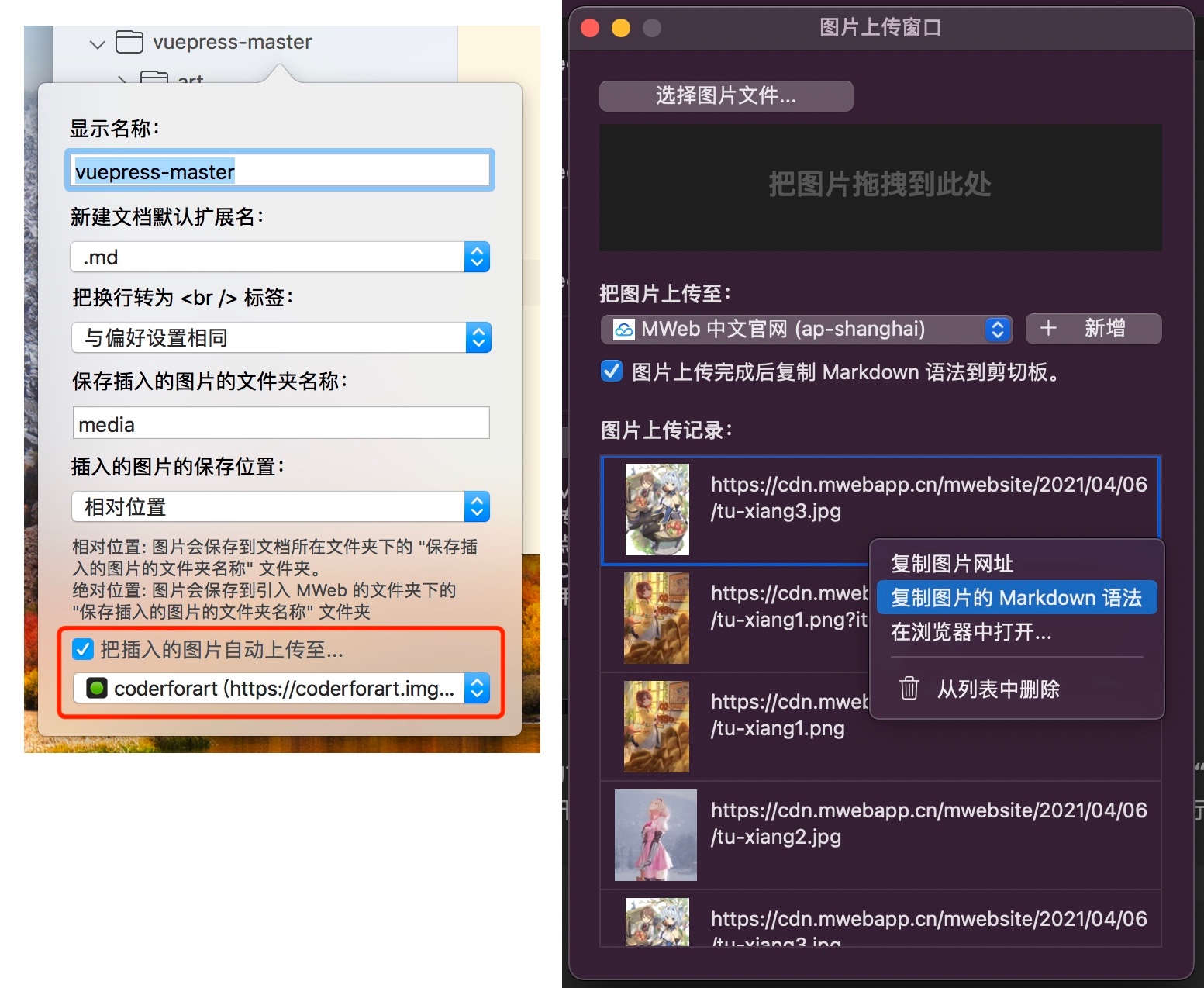 The method of inserting a local picture and then uploading remains the same. The function of automatically uploading when inserting has changed, and it has been changed to a separate picture upload window. Use the menu: View - Images Upload Window to open this window. The following figure is the change from MWeb 3 to MWeb 4. The left is the MWeb 3 method, and the right is the MWeb 4 method: